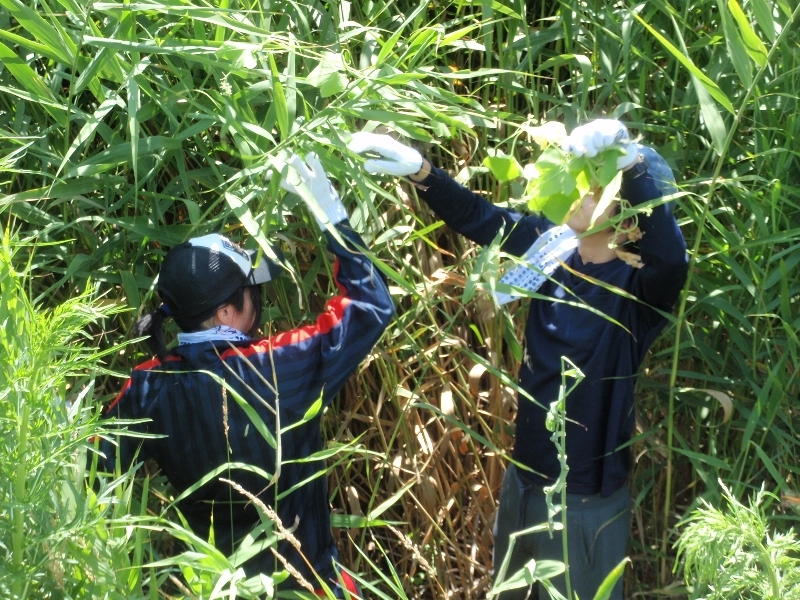 皆さんヨシをかき分けアレチウリの根元を捜して引っこ抜き、