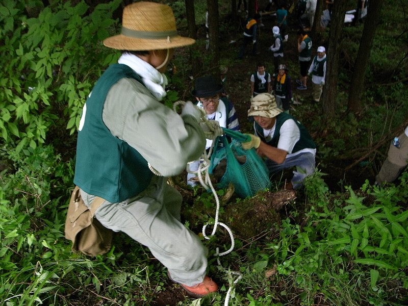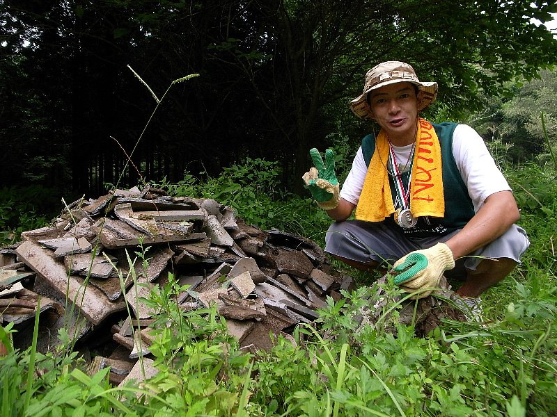 ちなみに上の2枚の写真は、崖下に捨てられた屋根瓦やタイルなどを集めてロープとネットを使って引き上げるシーンと、その現場で一番汗を流して下さった方とごみとの2ショット(^^ゞ
