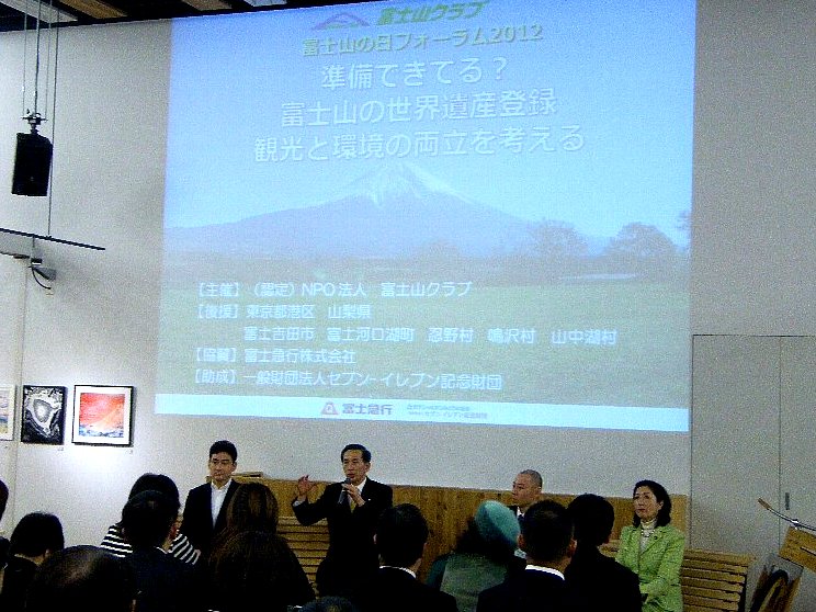 当クラブ主催の、富士山の日フォーラム2012が2月23日、山梨県(富士吉田市)と東京都(港区)内で開催されました。山梨会場には60人が、東京会場には170人が参集、富士山に世界遺産登録について、パネリストの議論を聞きました。