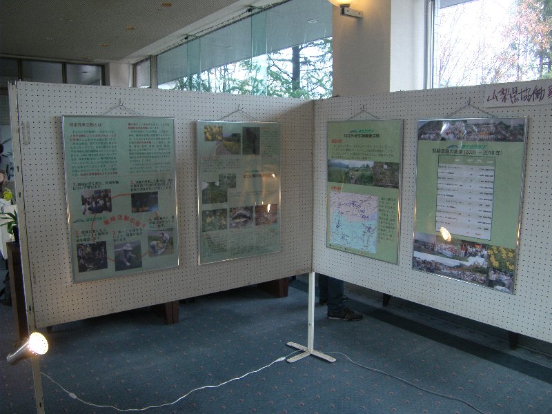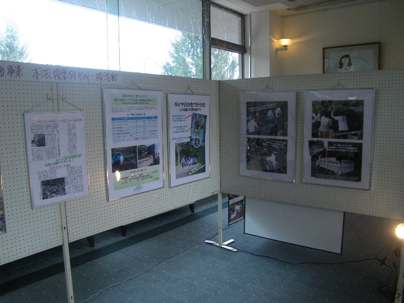 また両会場で、「山梨県地域活性化推進事業費補助金」を活用して行った「県と市民が協働! 不法投棄タイヤ一掃活動の取り組み」の活動を紹介、不法投棄防止を訴えるパネルを展示、来場者への解説を行いました。