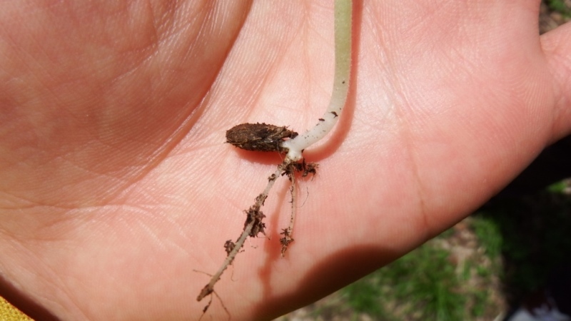 幼芽に付着したタネの皮からタネの大きさや色の様子。