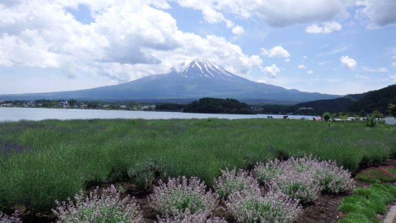 うっすらと紫色に染まり始めたお花畑と、見事な晴空、富士山のコントラストが