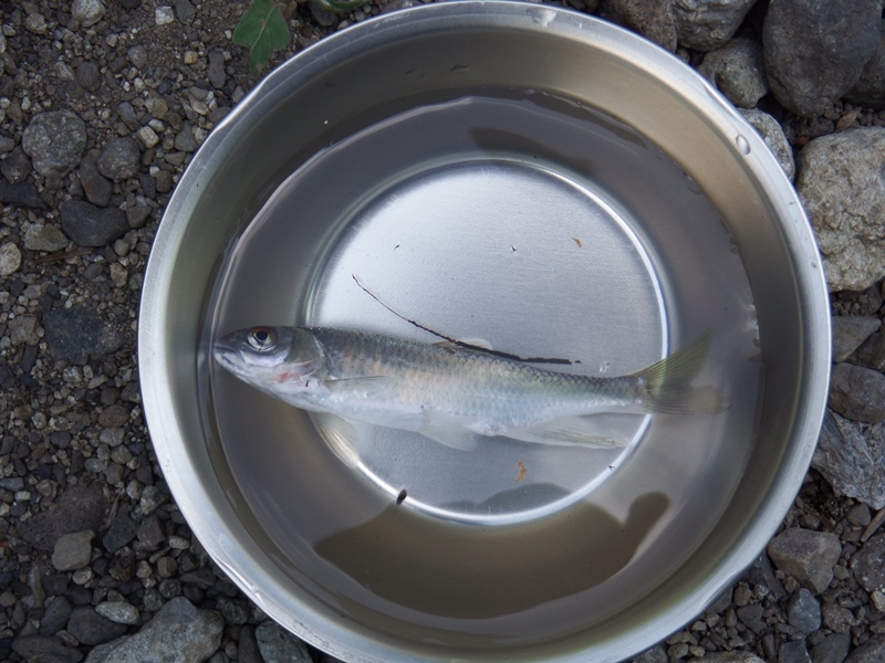 すばしこい子どもたちは、オイカワやカジカなどの小魚を網で捕まえ、観察しました。