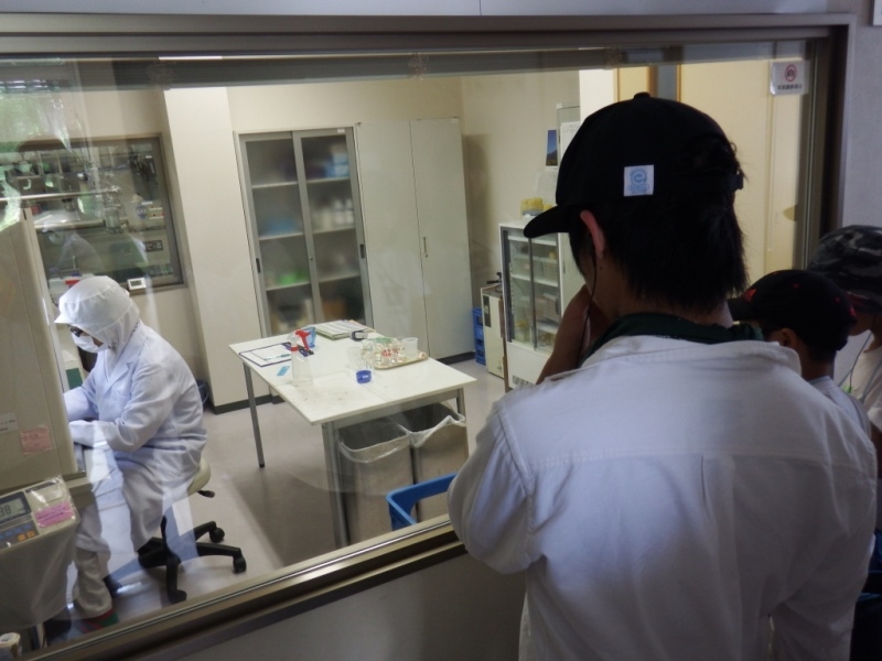 顕微鏡の前で水質検査をする人、水質感知のためのチョウザメ、
