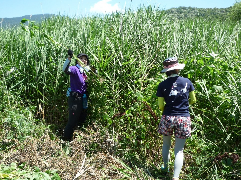 各担当場所の駆除を終えた皆さまは、湖畔のヨシ原に集結。