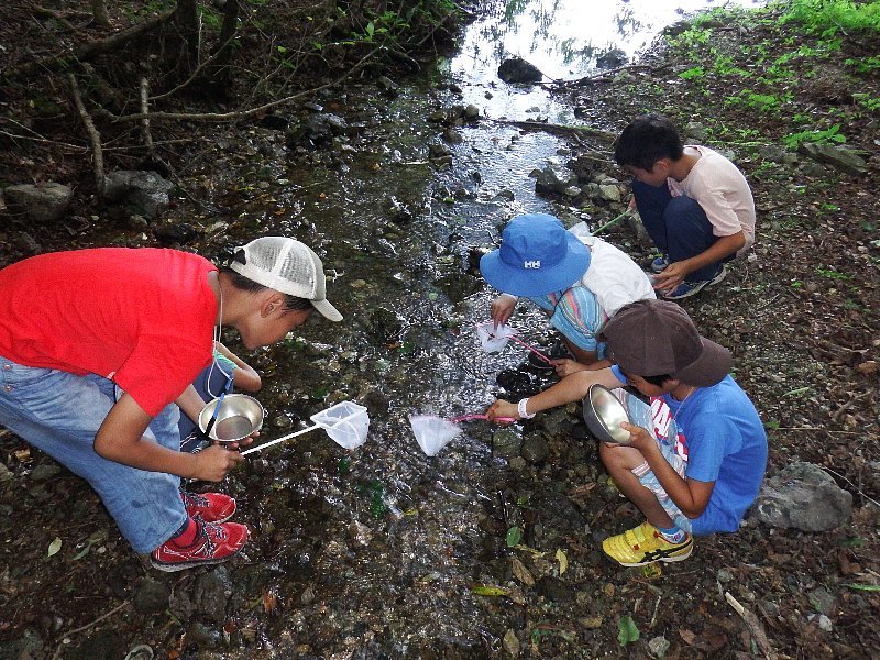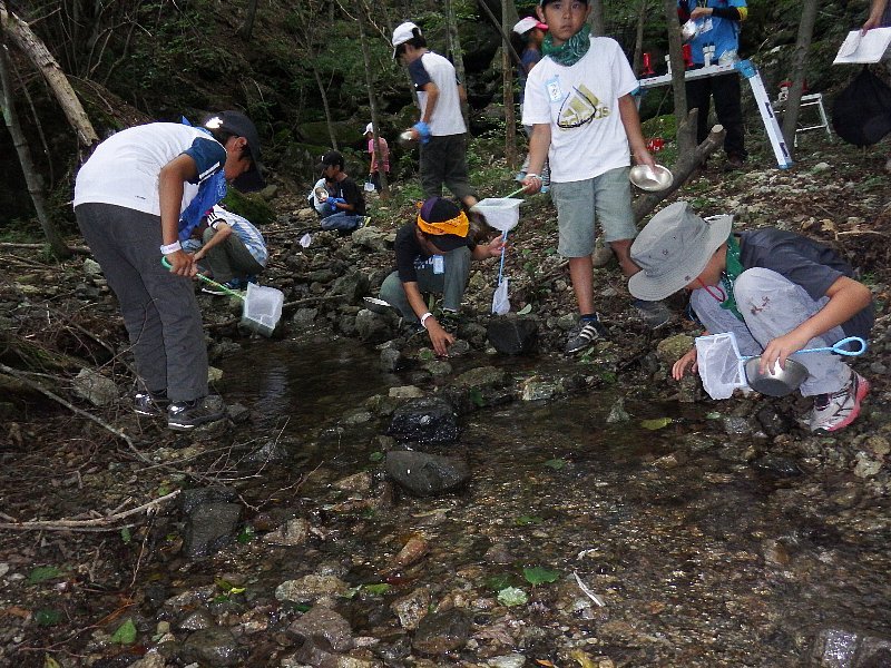 西湖に流れる川の下流と上流で、水の中に住んでいる生物を調査。
